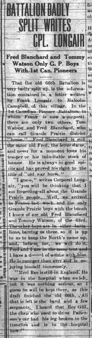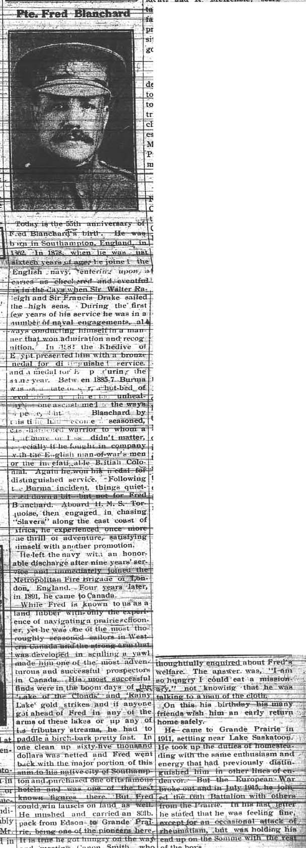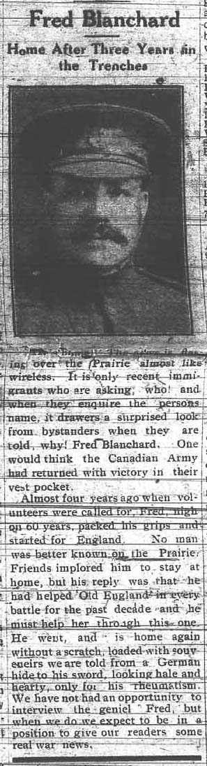 When fifty Grande Prairie boys left for Edmonton in July of 1915 to enlist in the 66th Battalion, Fred Blanchard was among them. He was 53 years old. On his attestation paper, he gave 1870 as the year of his birth and passed himself off as a 45-year-old. At some point his deception must have been discovered as the March 6, 1917 Grand Prairie Herald printed an article wishing Fred a happy 55th birthday as he celebrated in the trenches. According to two letters to the Herald from Frank Longair, Fred remained in high spirits and good humor during his military service. Upon returning to Lake Saskatoon after his discharge in January of 1918, Fred said that “he had helped Old England in every battle for the past decade and he must help her through this one.”