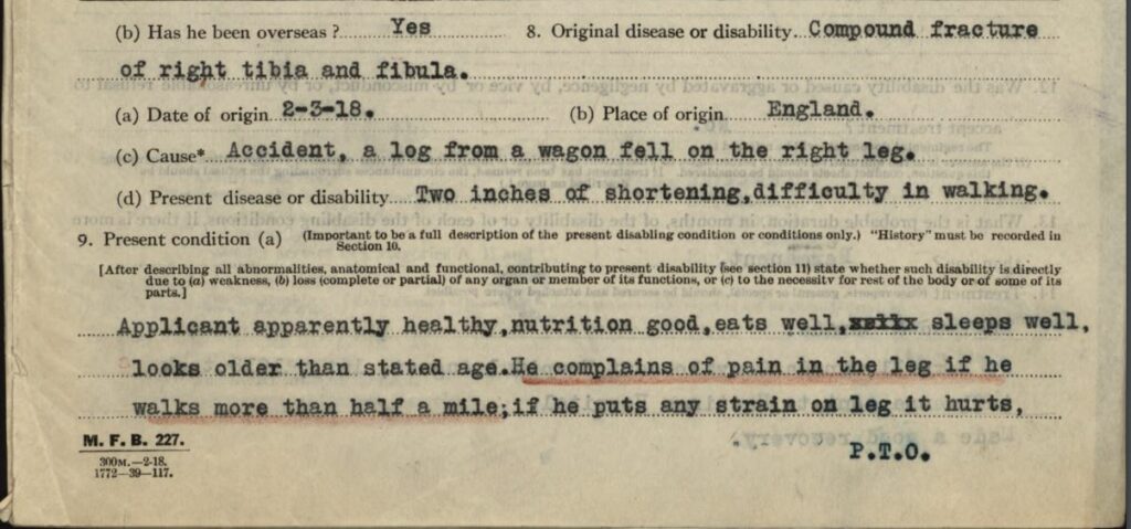 Image: An excerpt from Herbert’s military service file with details about his injury (Library & Archives Canada)
