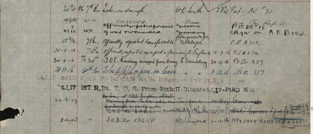 Image: An excerpt from Private Simmons’ military service file (Library & Archives Canada). Note the lines near the middle where he was “officially reported escaped & proceeding to England” and “T.O.S. [taken on strength] having escaped from enemy” in September of 1916.