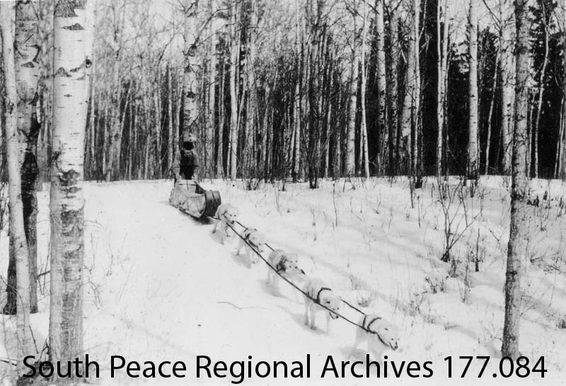 Image: Trapper and his dog team coming through the bush on the banks of the Wapiti, ca. 1930 (SPRA 177.084)