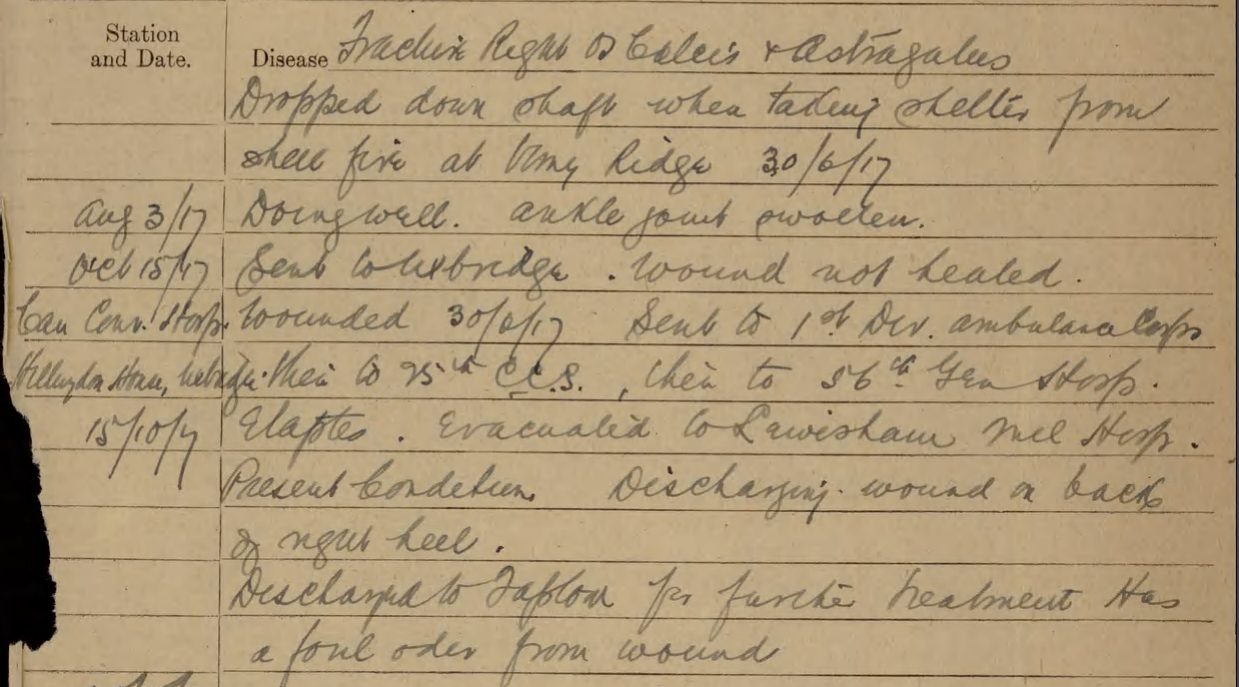 Image: Notes about Roy’s ankle injury from his military service file (Library & Archives Canada)