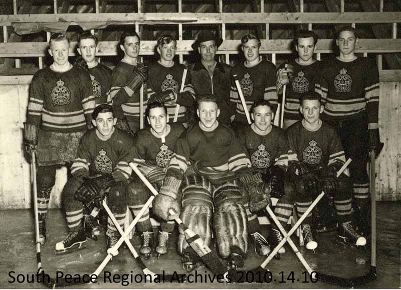 Image: Grande Prairie Legion Hockey Team which played for the 1950-51 season included, back row, W. Hiekkila, G. Bond, D. Swanston, H. Ayre, D. Crough, R. Card, C. Turner, E. Nelson, R. Wright, J. Listhaege, R. Neufeld, R. Rigler, J. MacMillan, F. Anderson, L. Giroux, J. Moore, K. Schielke. Also on the photograph is J. Lynn (Manager). (SPRA 2010.14.10)