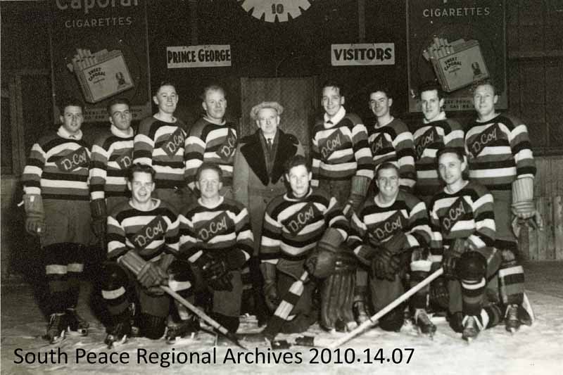 Image: “D” Company Hockey team which played for the 1949-1950 team included, back row: Wilf Blais, Bill Blais, Harley Patterson, Cliff Wright, Coach Ernie Ayers, Bob Kelly, Don Swanston, Bob Neufeld, Ernie Nelson. Front row: Walter Hiekkla, Bill Bessent, Bobby Pearson, Oscar Blais, Unknown. 1949-1950 (SPRA 2010.14.07)