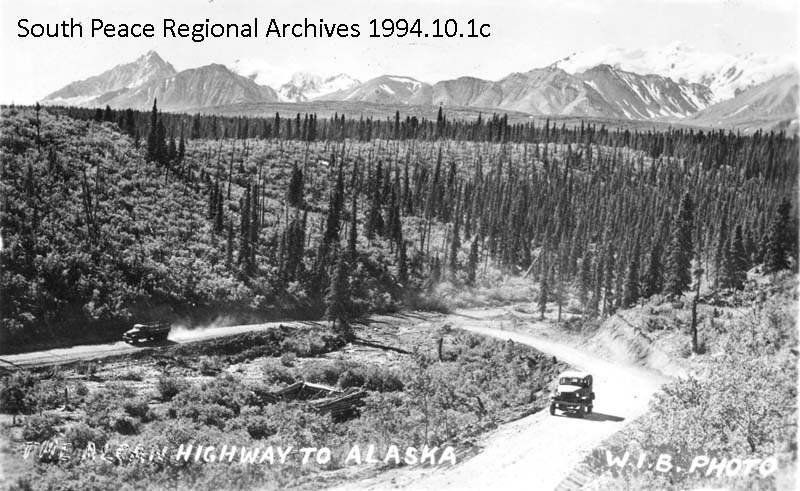 Image: Two trucks on a hairpin turn on the Alaska Highway, 1945 (SPRA 1994.10.1c)