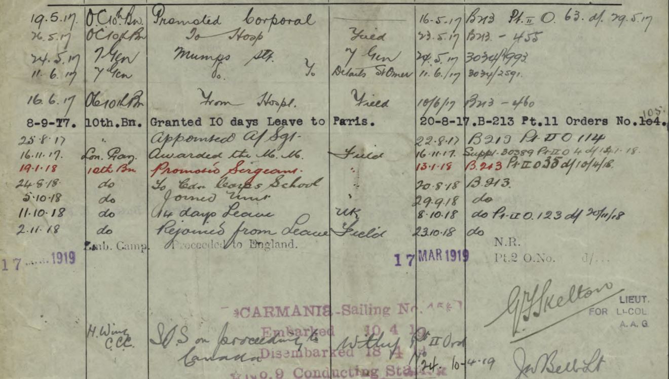 “On August 15, 1917, on Hill 70, this N.C.O. was in charge of a carrying party supplying the front line with S.A.A., bombs and water. While on this work the party were observed by an enemy airman and immediately afterward came under a heavy artillery file. By personal courage and good leadership, this N.C.O. took his party forward and delivered his load to the 7th Cdn. Inf. Battalion, which was greatly in need of same. He made a second trip although the party suffered several casualties, and again delivered his load.”