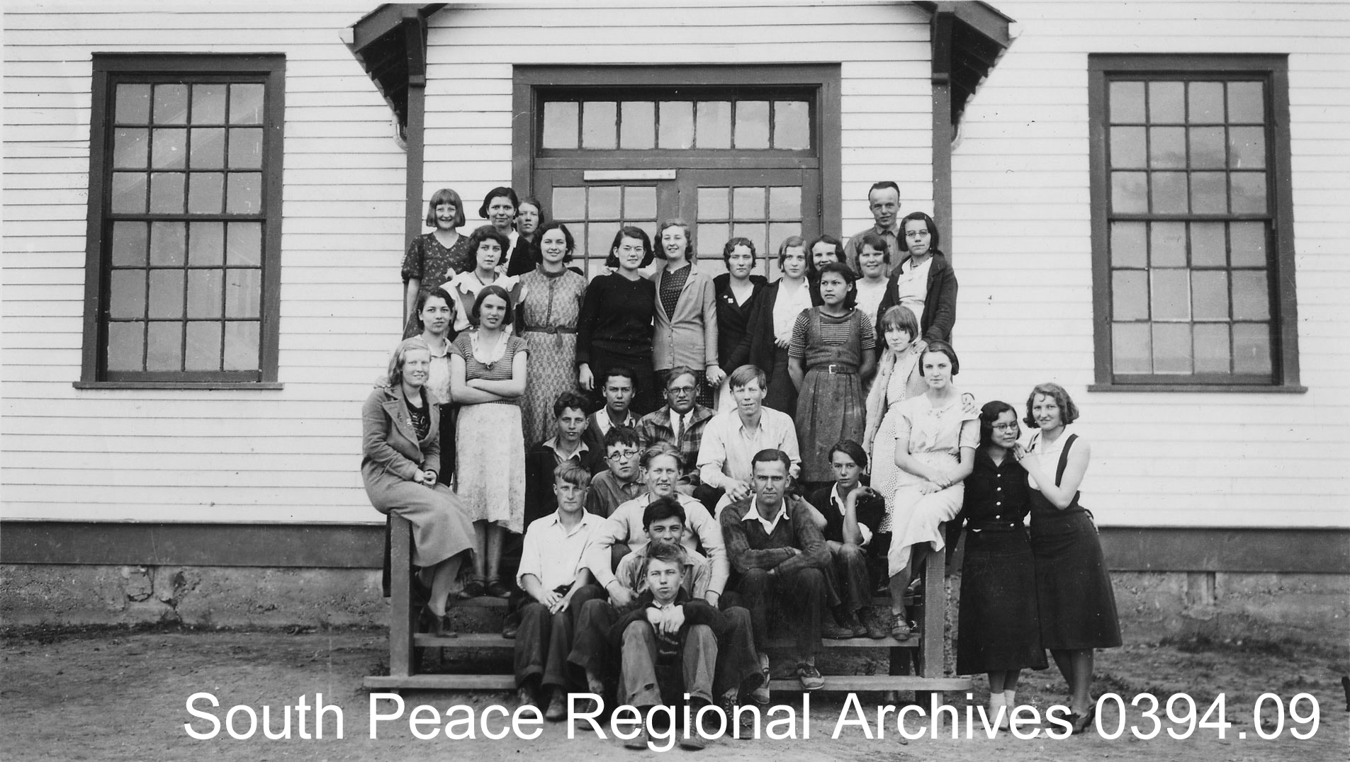 Image: Spirit River High School with students standing on the steps of the main entrance. Taken in June, 1934. Back far left is Jessie Edey, middle Alice Brown, far right Ethel Fildes and front far left Harry Edey (SPRA 394.09)