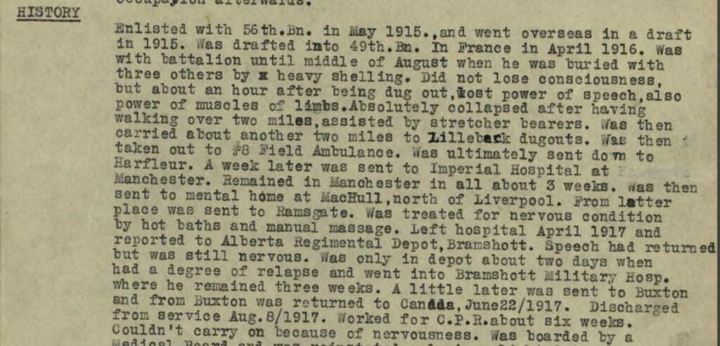Image: Notes from Joseph’s military service file, with details about having been buried by a shell explosion (Library & Archives Canada)