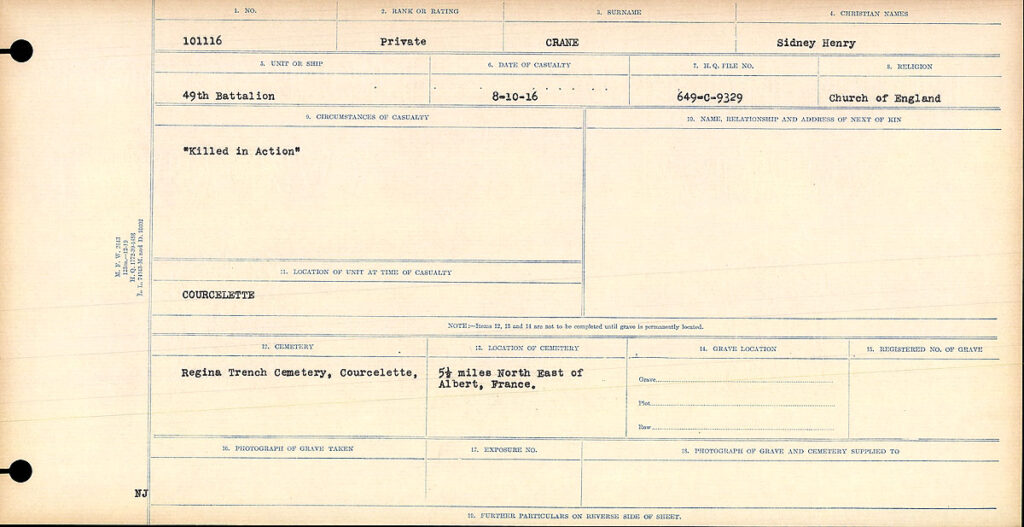 A grim letter from Jim McDonald printed in the Grande Prairie Herald on February 13, 1917 lists seven local men who were killed in action at Courcelette. Among them were both of the Cranes. Sidney was killed in action on October 8, 1916, and Stanley on October 13, 1916.