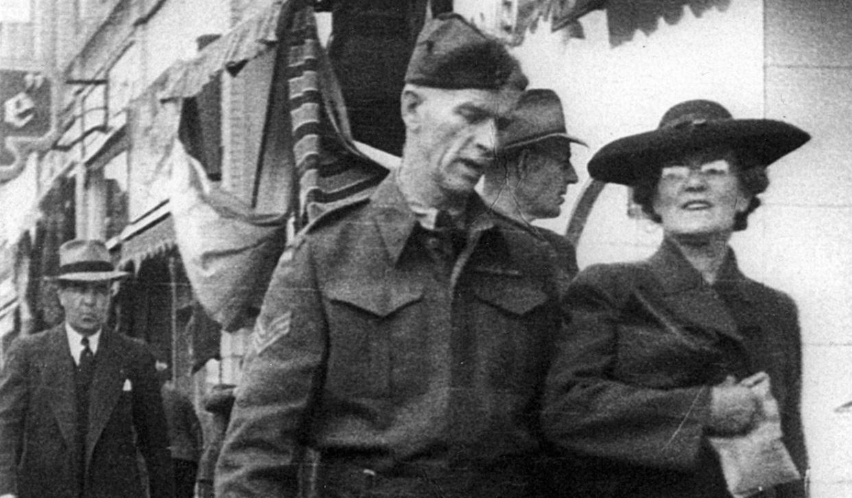 Photograph: William Adair in uniform walking along a city street and accompanied by a woman, ca. 1945 (SPRA 2008.102.01)