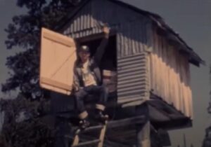 Image: A film still showing a man in a treehouse cache (SPRA 0253.01.11, Fonds 253: Jerry Stojan family fonds) Movie Monday highlights videos from the