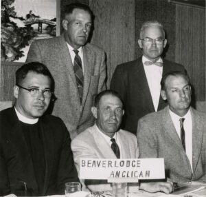 Image: Representatives of Beaverlodge Anglican Church. Front row: Rev., Les Harris, Sam Martin. Back row: __ Walker?, Leslie Emes, ca. 1950 (SPRA 032.08.08.0056) Leslie Emes