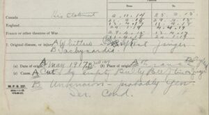 Image: An excerpt from the medical notes in Private Johnston’s military service file (Library & Archives Canada) Regimental Number: 18514 Rank: Private Branch: 9th Battalion