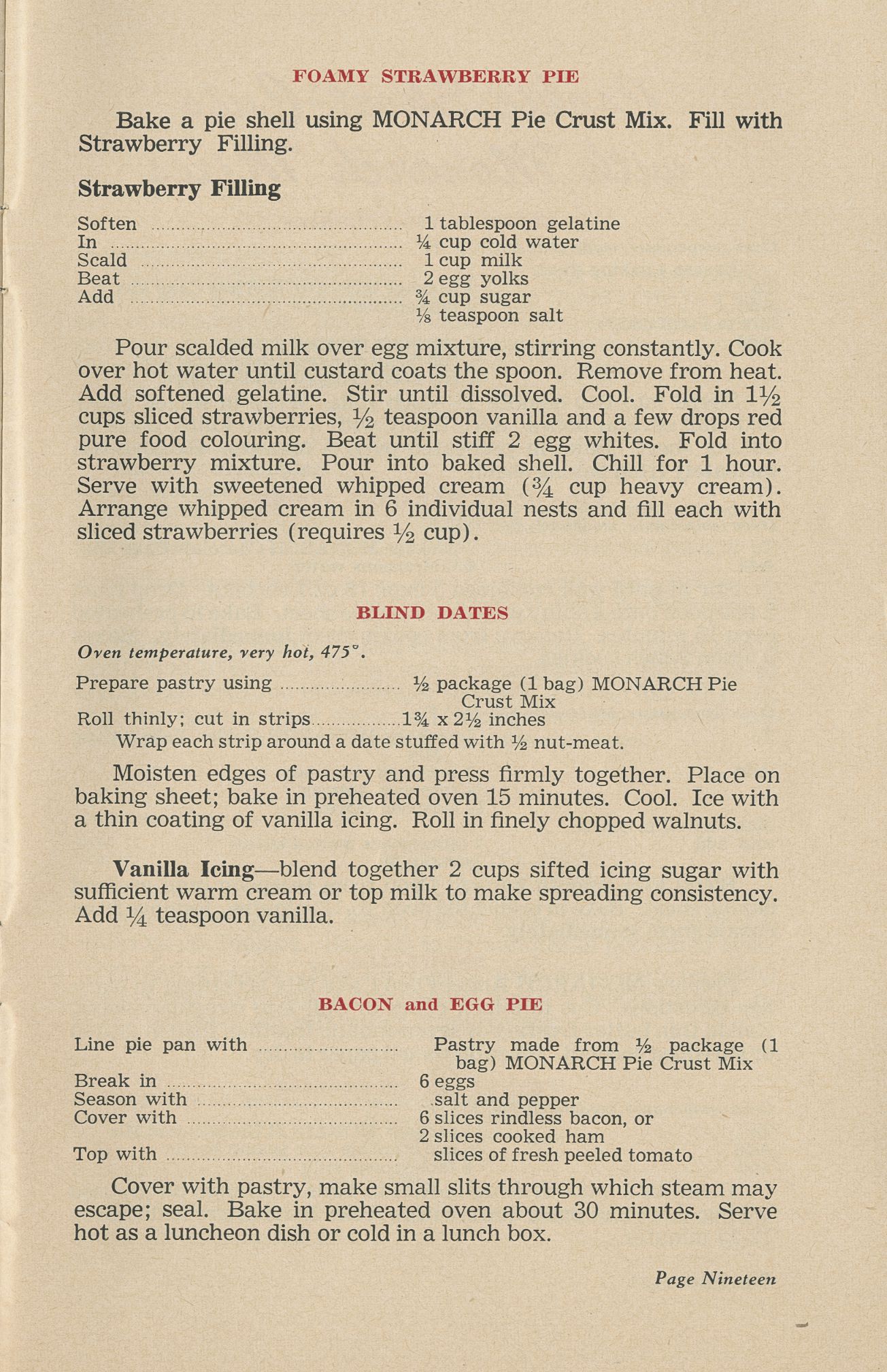 According to the Oxford English Dictionary, the earliest evidence of the phrase “blind date” being used to describe a romantic meeting between strangers was in 1921. A cookbook in our collection, published by the Maple Leaf Milling Company and filled with recipes featuring Monarch cake and pastry mixes, includes a recipe for a teatime treat called “Blind Dates.” We do not know the date that this booklet was published, but evidently the phrase was in common usage by that time.