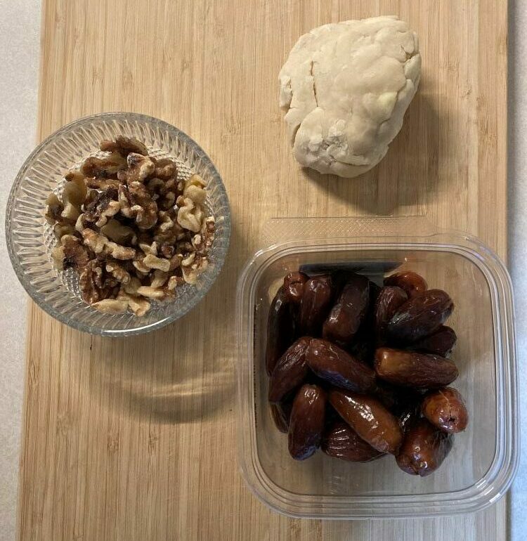 As you can see in the digitized recipe at the end of this post, the recipe called for a package of Monarch’s pie crust mix. However, I like to keep a supply homemade pastry on hand in my freezer, in case of a sudden craving for Saskatoon pie or sausage rolls. With the most challenging part of the recipe already taken care of, I had no difficulty acquiring the other two key ingredients: dates and walnuts.