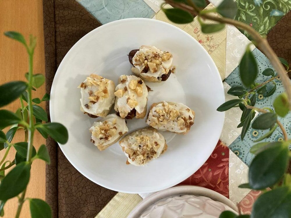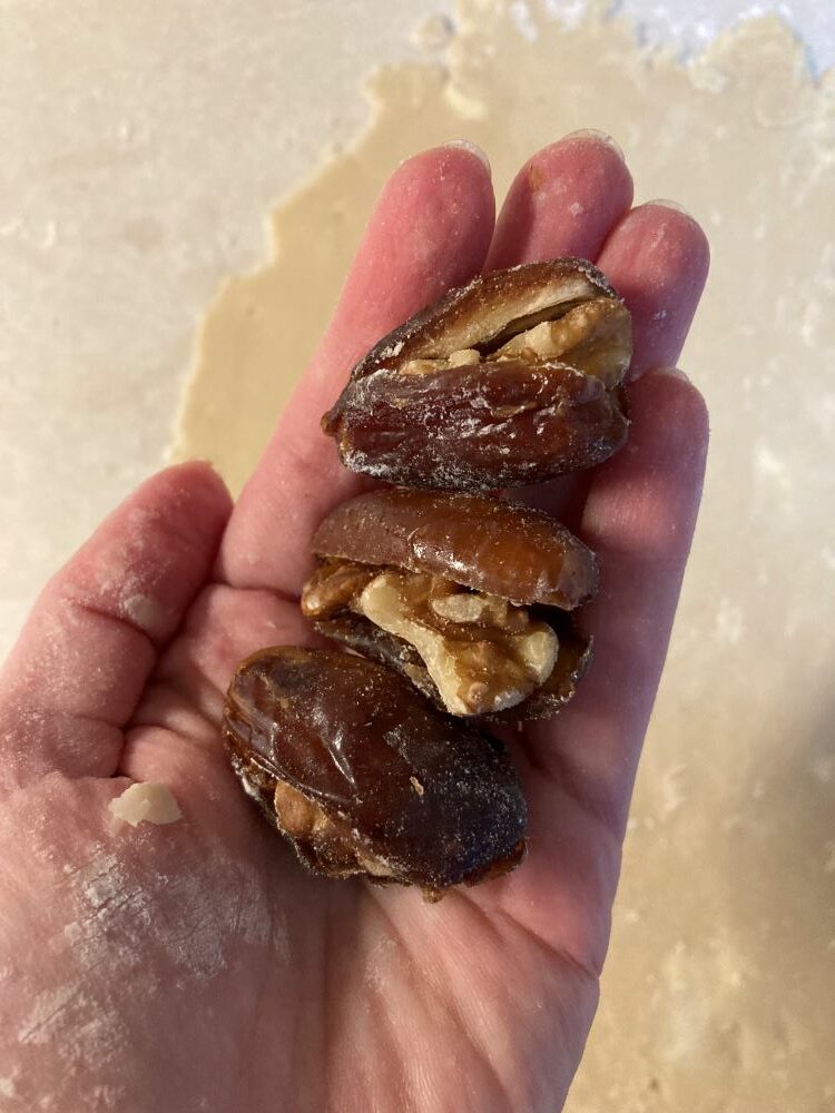 Stuffing walnut pieces inside of dates was an oddly meditative task. The stickiness of the dates made it easy to secure them once they were stuffed. While the tiny pastries baked, I chopped a few more walnuts for the sprinkle and whisked together a light glaze using powdered sugar, melted butter, and lemon juice in place of the recommended cream – only because I realized I had no milk or cream in my fridge, and I did not feel prepared to venture out at -45 to get some! “Making do” with the ingredients I had on hand felt appropriate for making a vintage recipe.