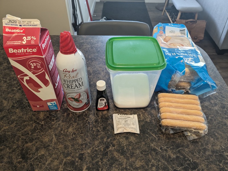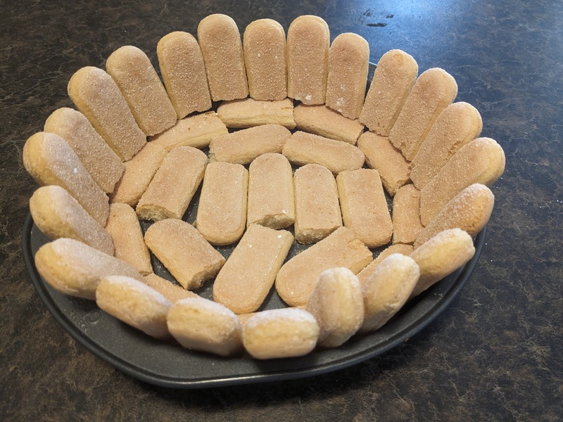 Once all the sugar was dissolved in the mixture, I left it to partially set in the fridge and turned to the crust. In a round container, preferably a mould or spring-form pan, I lined the bottom and sides. I then returned to the cooled mixture and attempted to beat until foamy. The last step before pouring the filling over the ladyfingers was to incorporate the 2 cups of whipped cream. First a small portion of the whipped cream is also beaten into the mixture, but the remainder is then lightly folded in to keep it light and airy.