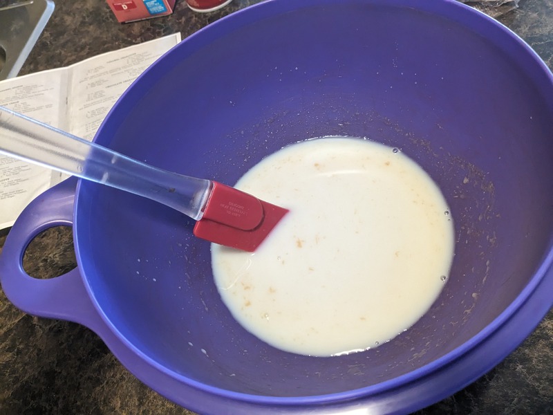 The first step of the recipe is preparing the 1/4 ounce of gelatin. The Household Science recipe likely used gelatin sheets, but what I had available was instant gelatin powder. After reconstitution the gelatin with 1/4 cup of water and dissolving it in 1/3 cup of hot milk I mixed in 1/3 cup of sugar and 1 ½ teaspoons of vanilla extract. The recipe actually specifies using fruit sugar or sucrose; unfortunately, I needed to employ a substitute and used standard white sugar (50% glucose, 50% sucrose).