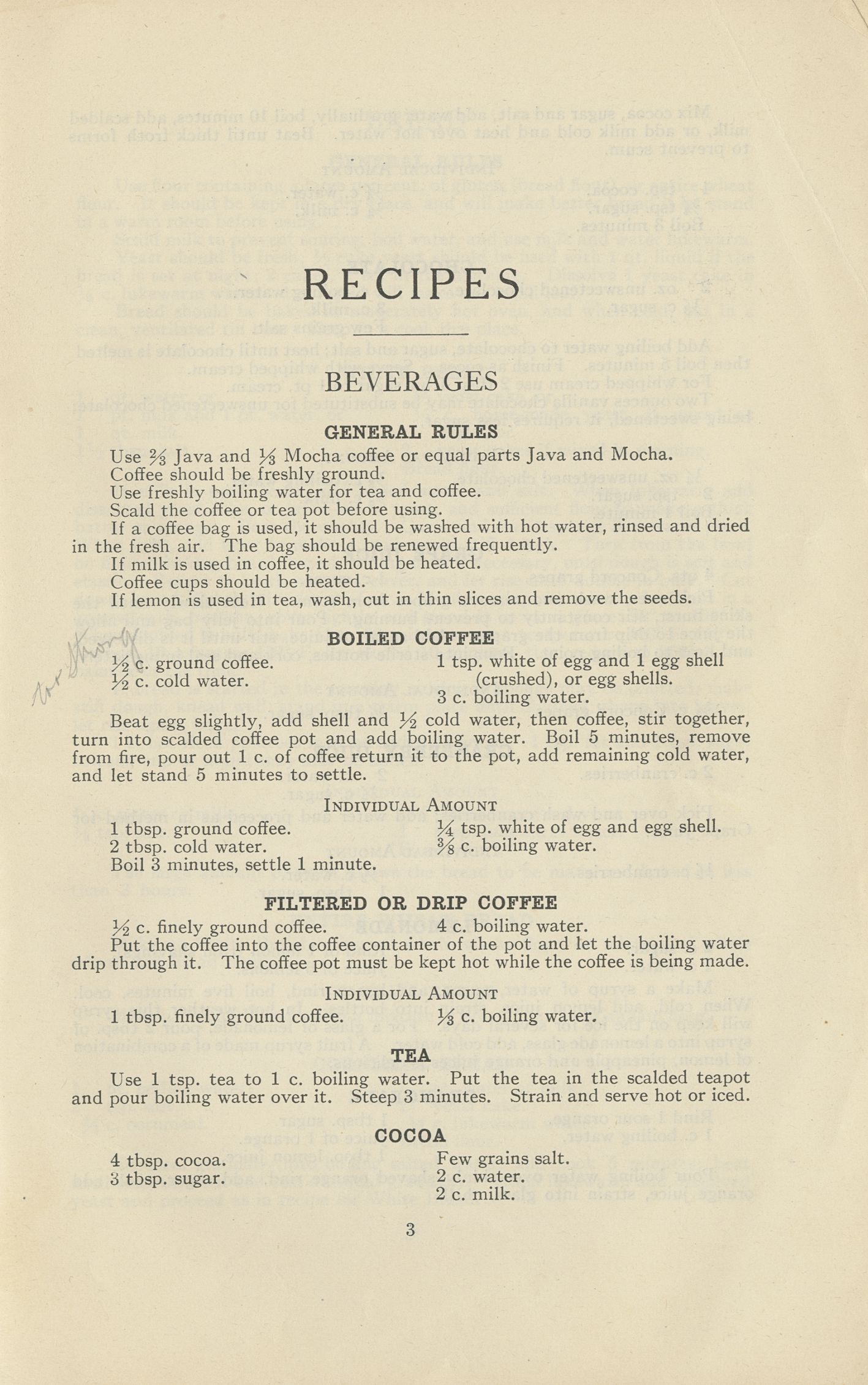 The first recipe we will look at today is a variation on Boiled Coffee from The Household Science Book of Recipes, published by the University of Toronto Press in 1933. The book was edited by Annie L. Laird and Edna W. Park, who were both were both prominent professors in the Household and Nutritional Science department. Laird described Household Science as, “… not only as a school of cooking, but a combination between art and science.”