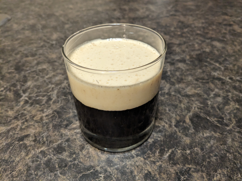 Once the coffee is ready just pour it into a glass and add the custard on top. It is enjoyable as is, but you can also stir to incorporate some of the custard into the coffee. And enjoyable it is; the drink is sweet and rich, the custard bringing out the best in the coffee. Since it falls into the category of dessert drinks, it is a recipe I will save for guests on special occasions or as an occasional treat to myself.