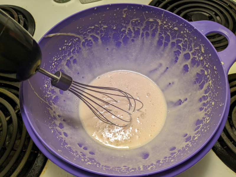 The first step in the recipe is to make the custard. I added two egg yolks and two tablespoons of condensed milk to a bowl then whisked for five minutes. Other recipes may call for additional ingredients like vanilla sugar or cheese. If you try a version of Giang’s egg coffee for yourself, I recommend using a modern electric mixer. Whisking by hand would be very labour intensive.