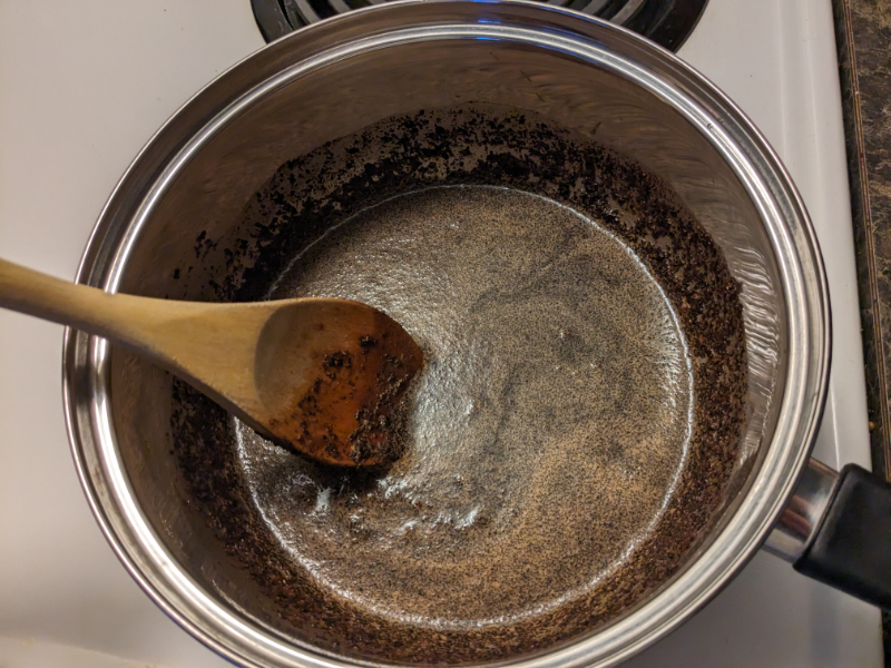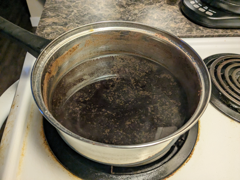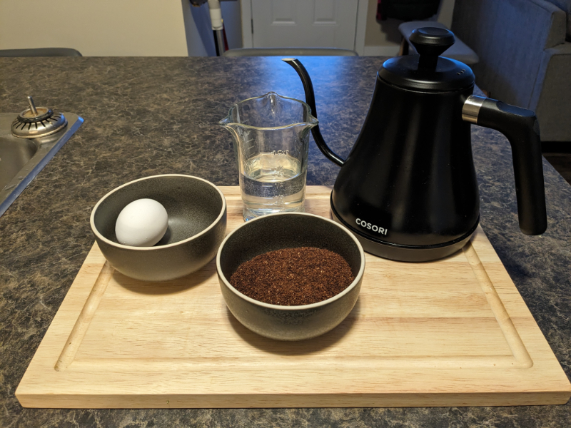 The first step of the recipe is to mix together the egg white, egg shell, coffee grounds, and some of the cold water into a slurry. Then the boiling water is added to the slurry and the pot is placed on the stove top to continue to boil the liquid. Once five minutes have passed I removed the pot from the heat and splash the rest of the cold water in. Within five minutes the addition of cold water should help the grounds that have mixed with the egg to settle to the bottom. What remains is supposed to be an amber liquid that can be poured into cups and enjoyed without adding milk.
