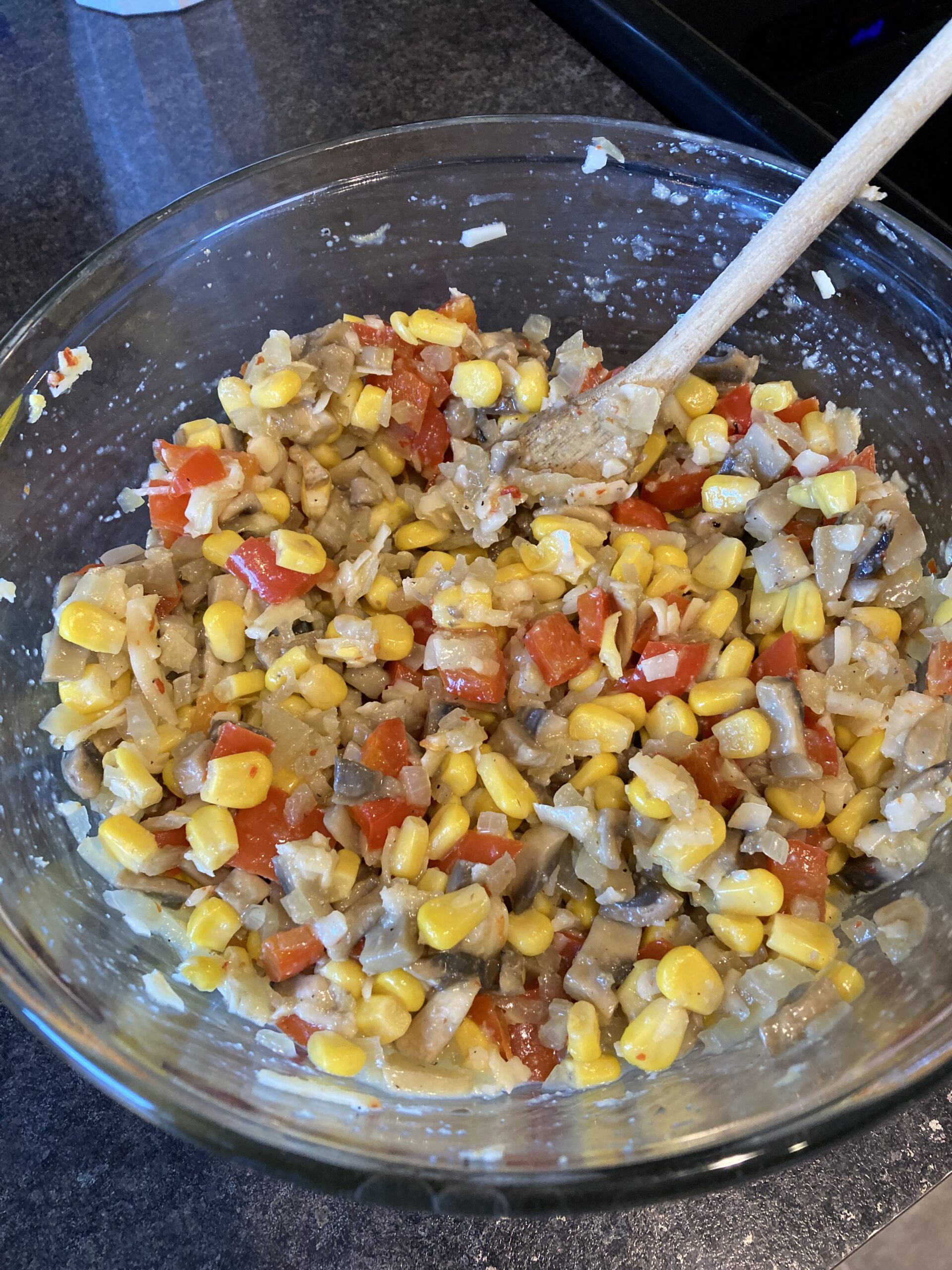I put the sweet potatoes on to boil while I sauteed up the other vegetables for the filling. The recipe called for olives, but as I was cooking for my mom, who doesn’t care for olives, I decided to leave them out. Once the vegetables had softened up, I added in a lightly beaten egg, salt and pepper, and some grated cheese. I selected a Monterey Jack with chili peppers as I thought the heat would add a little interest to otherwise mild flavors, and because it seemed appropriate to a dish called Mexican Pudding.