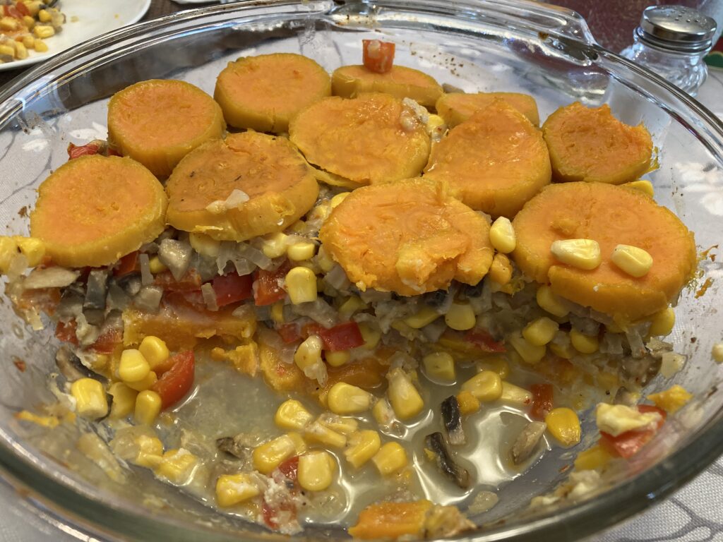 The hardest part of preparing the dish was peeling and slicing still-hot sweet potatoes. Assembling the layers – a layer of sweet potatoes for the bottom “crust,” followed by the filling, and topping it off with the remaining sweet potatoes – was easy but still produced an attractive, colorful dish. The instruction to “cook in moderate oven” reminded me of some recipes my mom and grandmas have shared with me: a list of ingredients with instructions to “mix and bake until done.”