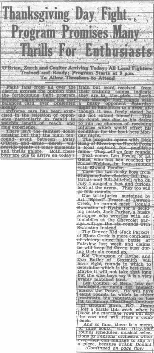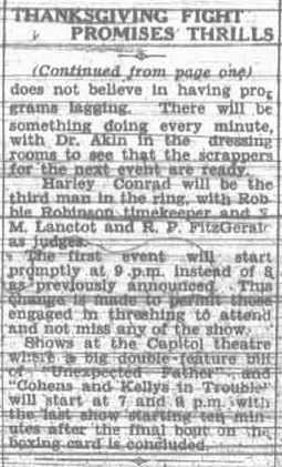 The only Thanksgiving fights at our house were over the drumsticks, but in 1933 Frank Donald sponsored a full card of boxing on Thanksgiving. Many local fighters were featured, as well as an orchestra to play during any gaps. The event was started later for farmers to get to the fights after threshing, and the movies in Mr. Donald’s theater were timed to start after the boxing was over. It’s not what would be considered a traditional Thanksgiving event, but no doubt it was popular.