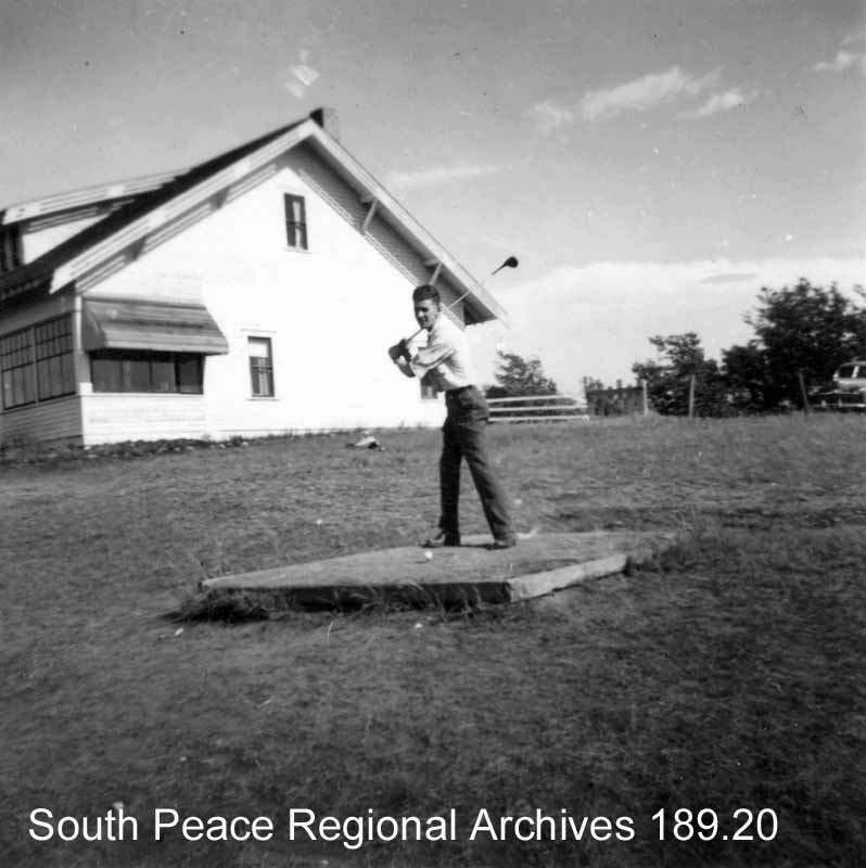 Richmond Hill Club House in the background with golfer teeing off at the driving range, ca. 1940
