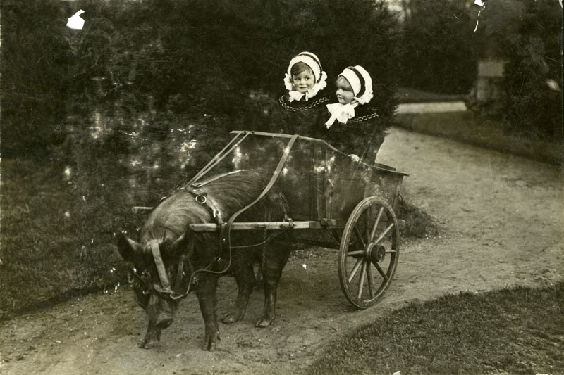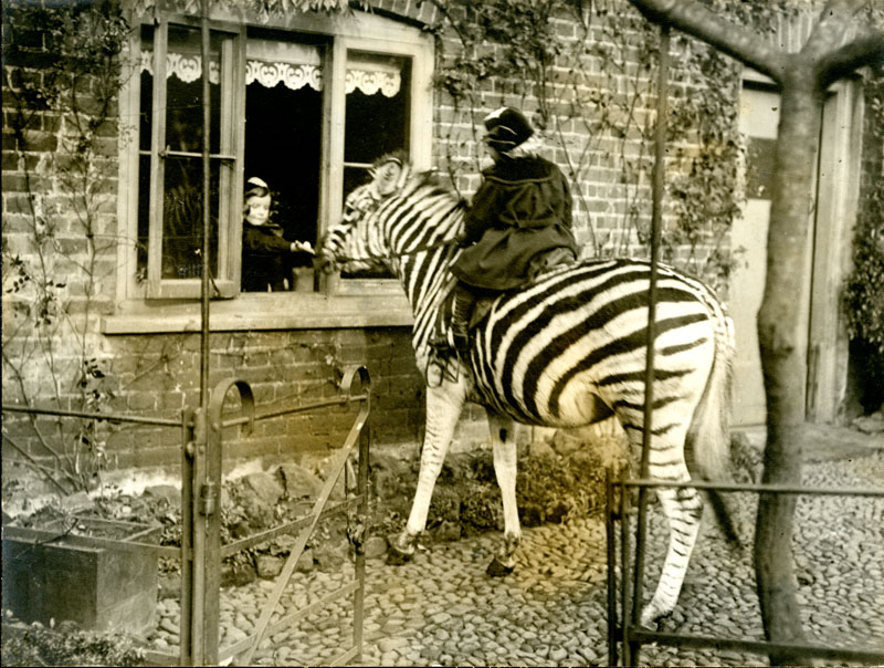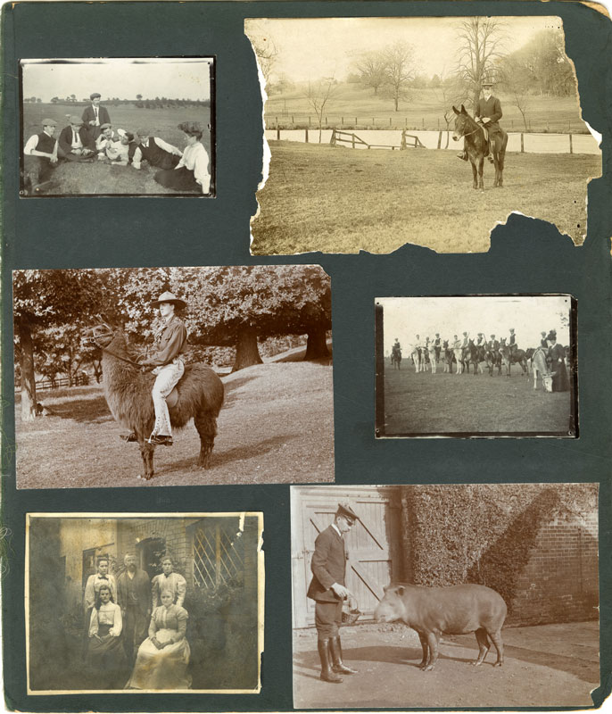 Game farms are places where wildlife is raised and kept typically for hunting. It appears that the specific game farm where the Hines family worked also contained a menagerie of exotic animals: for the private enjoyment of estate owners and their guests or possibly for commercial display. Menageries acted as symbols of prestige for the upper-classes and provided a glimpse into life in “exotic” Eastern lands. The Hines family album contains images of zebras, ostriches, and llamas as well as a number of photos of the family riding and playing with the animals.