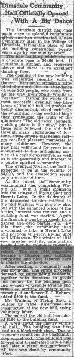 In August of 1946, the opening of the new hall at Dimsdale was celebrated with a dance attended by over three hundred people. The writer predicted that the new hall would stand for many years, and it still is, seventy years later. The bones of the original building are still there, but what changes there have been! I attended many dances and Canfor parties there over the years, and was impressed with what the community has accomplished in updating the hall. Visit their website here and have a look at the pictures if you haven’t seen the inside since the days when the “facilities” were basically outhouses attached to the side of the building! Darn cold in the winter, I remember. This is a great example of the kind of community effort that began in pioneer times and continues to this day.