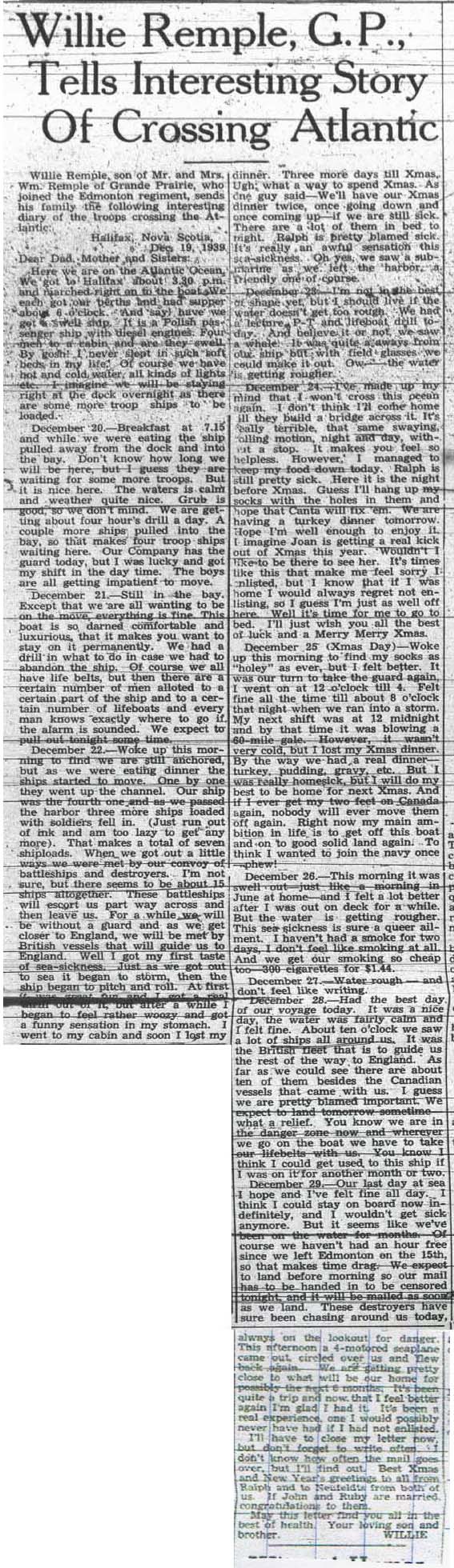 In 1940, Willie Remple, who had enlisted with the Edmonton Regiment, wrote home telling about the trip across the Atlantic. He was very impressed with the ship (while it was still in the Halifax harbour!) but by mid-Atlantic he says he won’t cross that ocean again – “I don’t think I’ll come home til they build a bridge across it.” He married in England in 1943, but I couldn’t find any more about him.