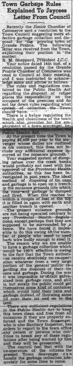 We’ve come a long way in dealing with trash since this article was published in 1948.  I wasn’t sure if garbage was a good subject for a blog, but thought people would be interested to know what the situation was over sixty years ago.  The Jaycees suggestion of a system of dumping refuse over creek banks made me shudder, as did the then “ideal method” of using a trench into which the cans and garbage were dumped and fired.  I do remember smoldering smelly fires in the dump.  Yuck.  The nuisance grounds were being operated according to provincial regulations, except for the fence – but apparently barbed wire thieves made that difficult to keep in place.  While sometimes we may think that things are over-regulated now, think of how much better we deal with this than they did back then.