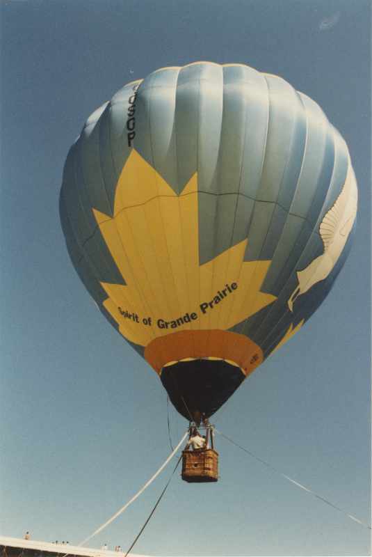 One of the first orders of business for the Trumpeter Swan Balloon Club was to procure a hot air balloon. According to the Trumpeter Swan Balloon Club, “Not only will this balloon fulfill our need for [a] balloon, but even more important would become a unique symbol of Grande Prairie. The promotional value to Grande Prairie would be tremendous.” The club contacted Cameron Balloons in England for the task. They commissioned a custom balloon that featured the trumpeter swan symbol along with the name of the balloon, the “Spirit of Grande Prairie.”