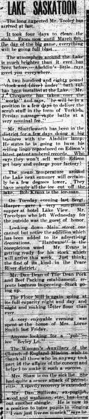 The Lake Saskatoon News in the March 3, 1914 paper had several interesting items, but the one that I especially noticed was the installation of a “duck and (dive) under” bath tub.  I thought this was perhaps a real piece of equipment, but couldn’t find any reference to it.  The writer of the Lake Saskatoon news tends to use highly embellished language in the reports, so perhaps this is an example.  There is also a reference to the amount of ice cut out of the lake for summer use – I think we forget what an important enterprise that was in pre-refrigeration days.  The last item that I thought was rather amusing talked about Dan Sullivan, who had ads frequently in the papers issuing and accepting challenges to box, and apparently having also been a woodsman and washman, now taking up the position of singing tutor!