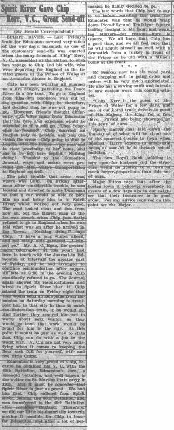 There are several articles about John “Chip” Kerr of Spirit River, who won the Victoria Cross in World War I.  This is the first one I saw some time ago, and of course wound up doing more digging until I found his story.  I especially like this item; he certainly had a sense of humor.  He served again in World War II, becoming a service policeman at Sea Island in BC.  He retired in Port Moody, where there is a Legion Auditorium and a park named for him, and his home was declared a Heritage Site.  There is also a mountain in Alberta named after him.  It is splendid that ten years after the war when he was invited to London for an Armistice Dinner with the Prince of Wales, there was so much support to enable him and his wife to make the trip.