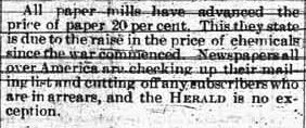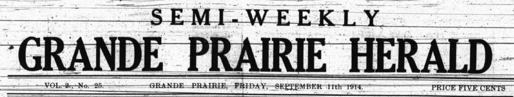A short item in the Sept. 11, 1914 paper showed how quickly the war had started to affect prices. The increase in the price of chemicals used in paper making had caused paper to rise in cost by 20%. Newspaper subscribers who were in arrears would be cut off. At the time, the price of a one year subscription to the Grande Prairie Herald was $2.00.