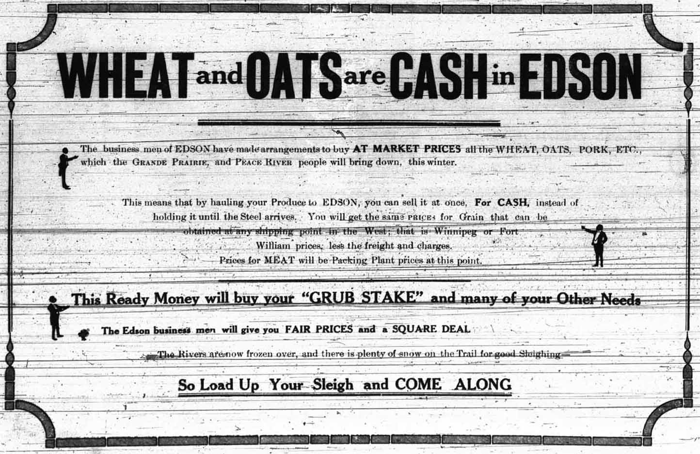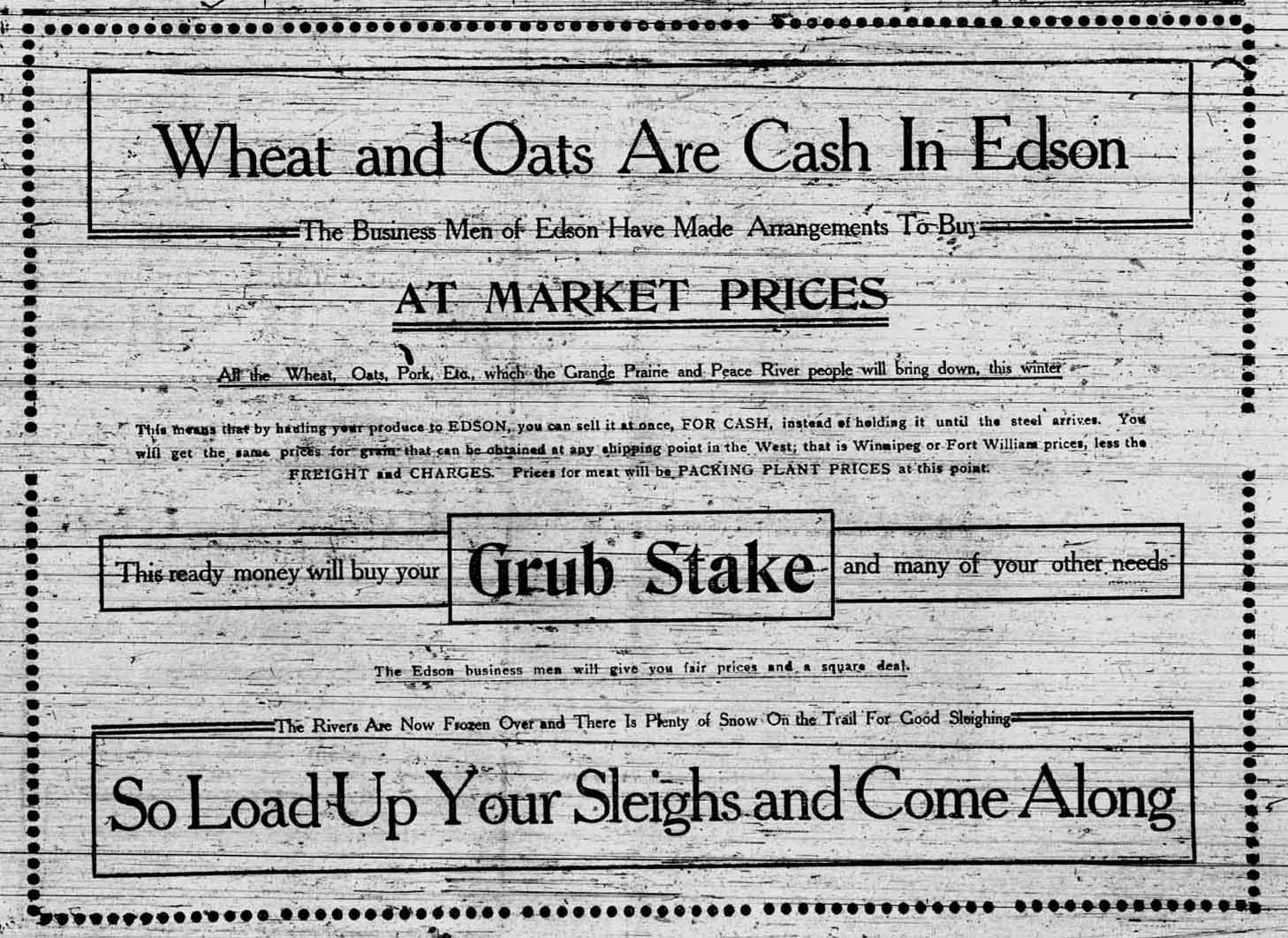 Even during Christmas week practicalities were in the forefront. This large ad appeared in both the Herald and Signal newspapers this week. It seems that knowing the railroad would reach Grande Prairie in 1916, farmers were holding grain to ship by rail rather than the arduous trip over the Edson Trail. The merchants of Edson placed this ad to encourage the shipment of grain during the winter, offering immediate cash .