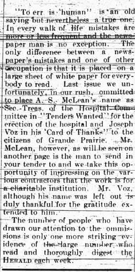 Once again the pickings were pretty slim in the paper for this week in 1914, so I have returned to the Editorial, where the Editor acknowledges he had omitted a couple of names in articles in the previous newspaper. The last paragraph shows his ingenuity in turning this apology into a bit of a ‘horn-blowing’ for the Herald.