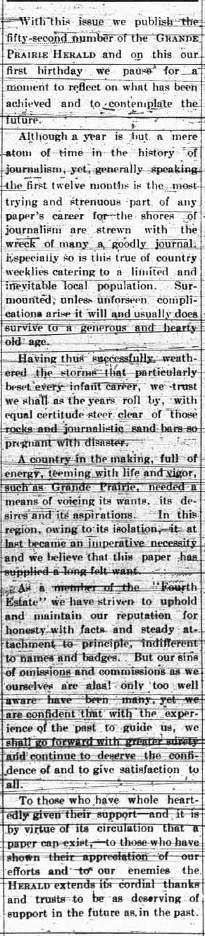 First Anniversary of Grande Prairie Herald Editorial by Wm. C. Pratt.