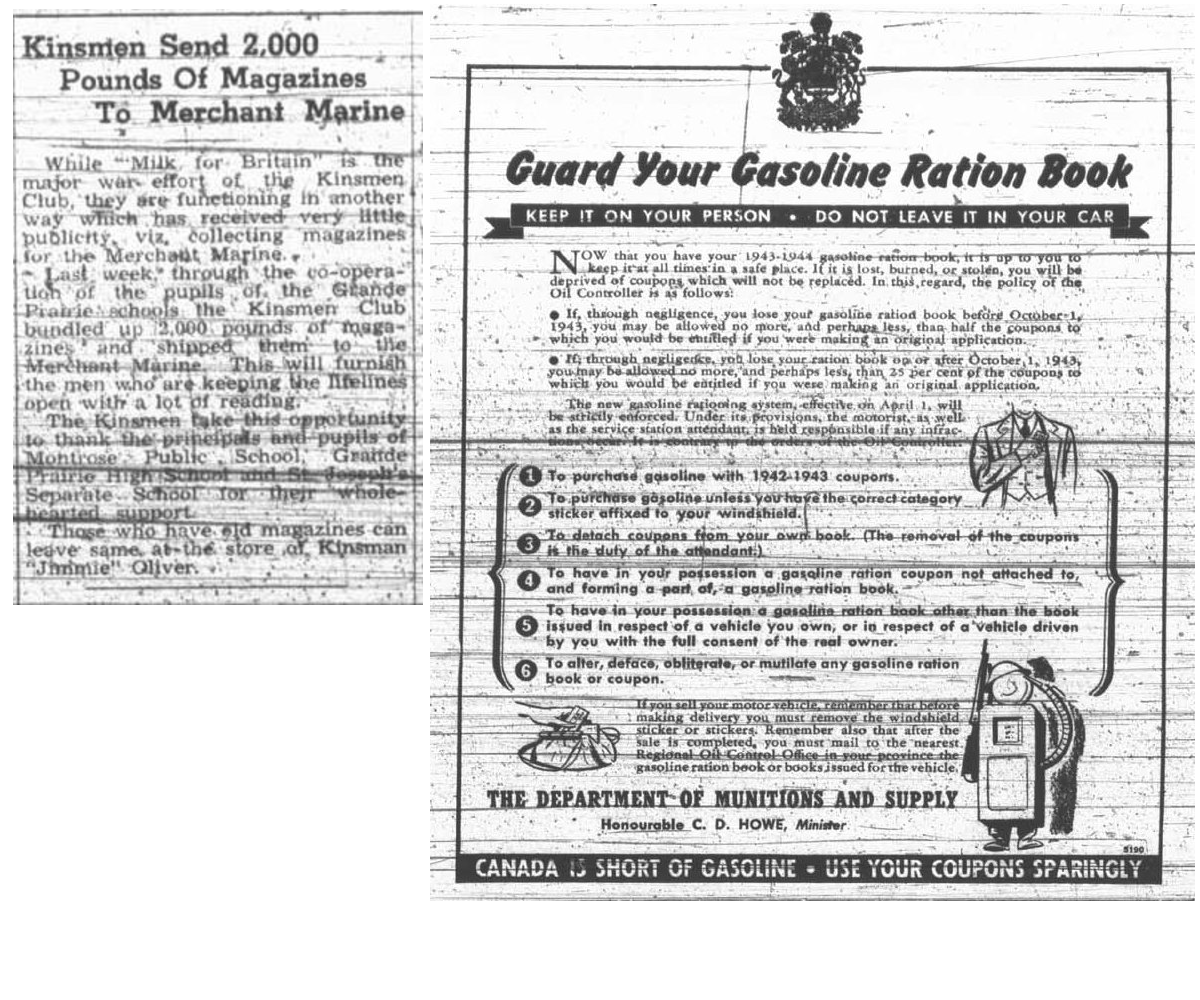 The April 8, 1943 issue of the Herald Tribune seemed to have an unusually large number of articles and ads to do with the war effort. The four items I have chosen are a glimpse of how daily life, even in remote northern Alberta, was affected by war.