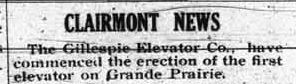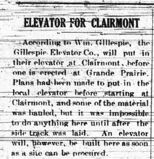 Also in the April 25th paper was a short note in the “Clairmont News” stating that the first grain elevator on the “the Grande Prairie” would be built at Clairmont. Later in the paper was an article explaining why that was.