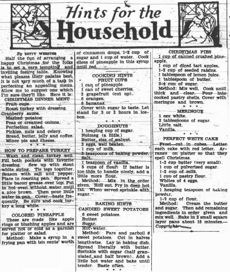 I like reading the recipes that appear in the old newspapers, and have tried a few of them, with mixed results. I have made the Lemon Mince Meat recipe that appeared in the Dec. 13, 1932 column “Christmas Dainties” twice and thought it was very good. I did make some changes. I made tarts, not pies and I cut the amount of sugar way down to 1 cup to 1 and a half cups. The recipe also says to add 1/4 cup melted butter per pint. When I made the recipe it made 1 quart, and I added 1/4 cup of melted butter to the quart and that was fine. It keeps well in the fridge for a couple of weeks. On the same page, the Hints for the Household article also had Christmas recipes, suggesting a menu which included an odd recipe for Christmas Pie. I made this recipe and learned that 1-2 as printed, means one half, and 3-4 means 3/4! But it was surprisingly good (thanks Rhonda from the Museum for trying it with me). Again, I made tarts, not a pie. I used 1/2 cup of raisins, and again cut the amount of sugar. I used 1/4 cup instead of 3/4 and thought it was plenty. I had doubts about the meringue, but it was a nice finish. This filling also keeps well in the fridge for a while, and I wouldn’t recommend baking too many at a time – only what would be eaten the day of baking or the next. Happy Baking!