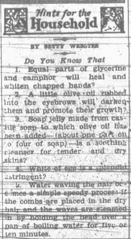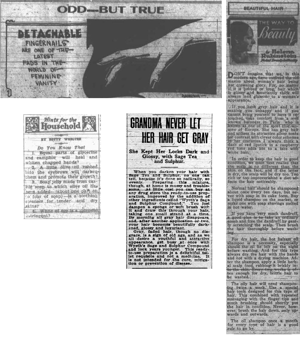 march 11 2014 blog 5While the earlier newspapers contained “telegraphic news” from around the world, and other filler items, it wasn’t until the early 1920’s that regular features started to appear. The first ones I noticed were a fashion column, and one on Household management. There were other regular items such as Sunday School Lessons, serial novels, a medical column and crossword puzzles. A popular topic, then, as today, was beauty advice. The earliest items I found were ads, but by the 1930’s there were regular columns by people such as Helelna Rubenstein. This week I thought it would be fun to look at some of the items that appeared in the newspapers in the 20’s and 30’s, a time when artificial fingernails were featured in “odd But True”, and it was suggested that a “simple speedy process” for waving the hair was sticking your head over a pan of boiling water for 5 or 10 minutes. I chose mainly articles on hair care for this time.