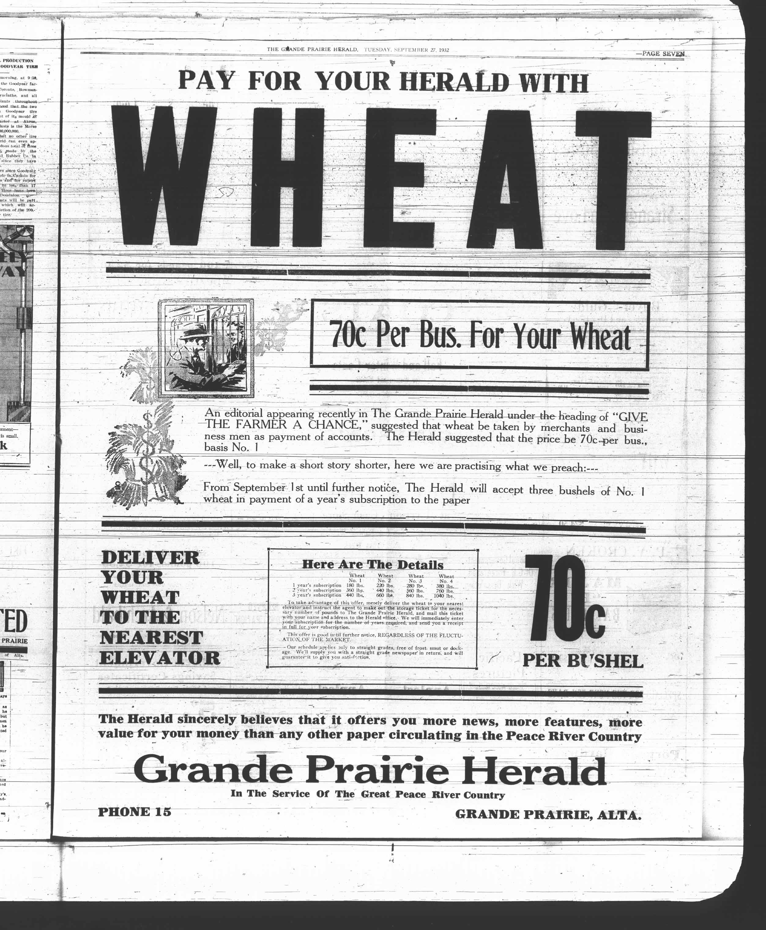 This full page ad in the Sept. 27, 1932 paper, really stood out. I wondered why there had been several references in the papers during that time to merchants accepting wheat as payment for goods in local stores. What I found was that the price of a bushel of No. 1 Northern Wheat had dropped from $1.03 in 1928 to 29 cents in 1932 – lower than at any time in the preceding 400 years. It is significant to note that 1932-33 were the years of the Ukrainian genocide, when all grain was taken from the Ukraine and put on world markets. The world wheat surplus was estimated at 600 million bushels. Local farmers were struggling, and in those days, Grande Prairie’s economy was agriculture dependent, so the newspaper Editor suggested trading wheat for goods as a way to help out farmers with full grain bins and empty wallets.Sept 24 newspaper