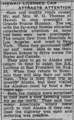 The July 15, 1948 paper reported the sighting of a car with Hawaii license plates in town. It created enough attention for the newspaper to send someone to talk to the car’s owners. I remember when you could tell if an Alberta car was from out of town, just by the license plate numbers.