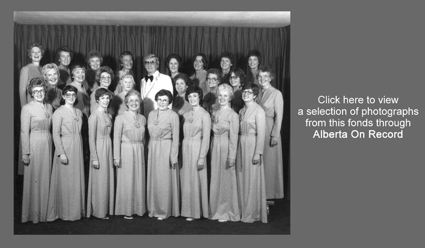 Group photograph of Grande Prairie’s singing ensemble, the Sweet Adelines, with choral director Don Thompson. Back row: L-R, Eileen Sweetnam, Gwen Newell, Winona Lancaster, Betty Belford, Betty Ludbrook, Coreen Evashkevich, Lois Farquharson, Betty Ryan. Center Row: Caren Lang, Evelyn Reimer, Elsie Lazoruk, Sela Watts, Don Thompson, Pat Newberry, Clarice Paul, Brenda McKinnon. Front Row: Joyce Boyce, Linda Tarle, Bonnie Ribar, Charlotte Wood, Billie Ford, Norma McNeil, Nim Piggot, Laferne Rodacker. |