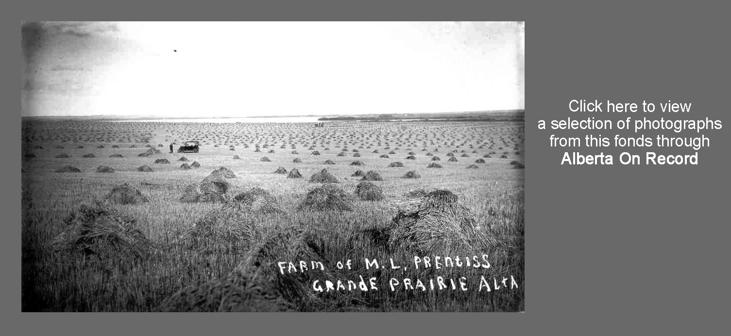 The collection was donated to Grande Prairie Regional Archives by Mack Prentiss, son of Marion Prentiss and Mary Sheer, in 2003. An accrual of Prentiss family records was donated in 2010 by Mack’s daughter Marion Hoveland.