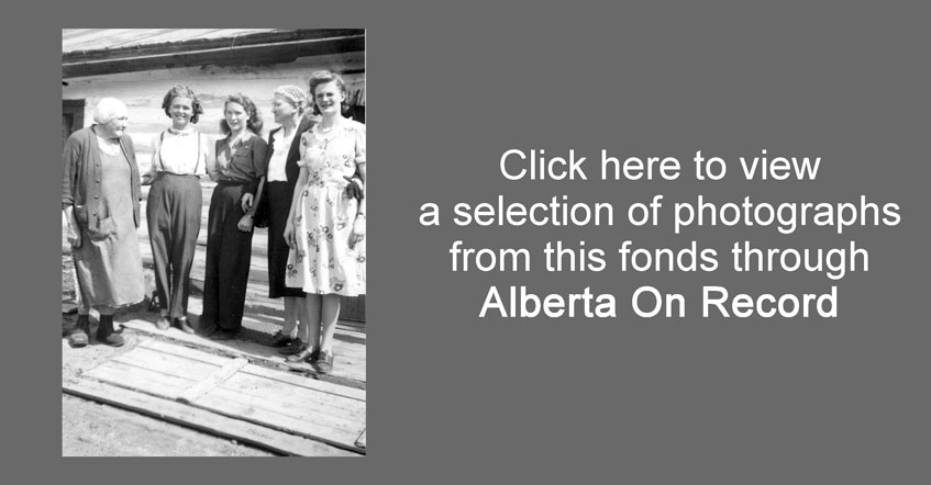 The fonds consists of school memorabilia and paper artefacts from Betty’s childhood, building the Welter family home, and her volunteer activities; certificates and news clippings detailing Betty’s activities with the Canadian Red Cross, and a book of minutes from the Local Association (Mother’s Auxiliary) of Guides, Brownies and Rangers from 1965-1970; a writing portfolio of biographies of the Smart family and Jack Welter, as well as memories of incidents which happened in her childhood, her teenage years and years as a young wife including income tax forms from 1943-1973; a wide subject range of photographs, from local Grande Prairie scenes and people to the construction of the Alaska Highway; and research files containing material researched for the archives: Miller’s Taxi; Teen Town; and a publication “The Inside Track” which traces the history of Union Tractor which Betty’s husband Jack worked for. An accrual in 2010 consists of plans and blueprints of the Welter house and their duplex. An accrual in 2013 consists of clippings and biographies for several Wapiti Lodge reunions, cookbooks, and a copy of the publication “This is Alberta in 1963.”