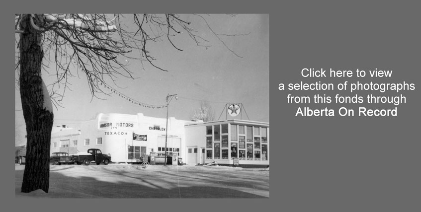 Copy of a photograph showing Windsor Motors, the Chrysler dealership, and Texaco station in Grande Prairie after the glass addition was made. |